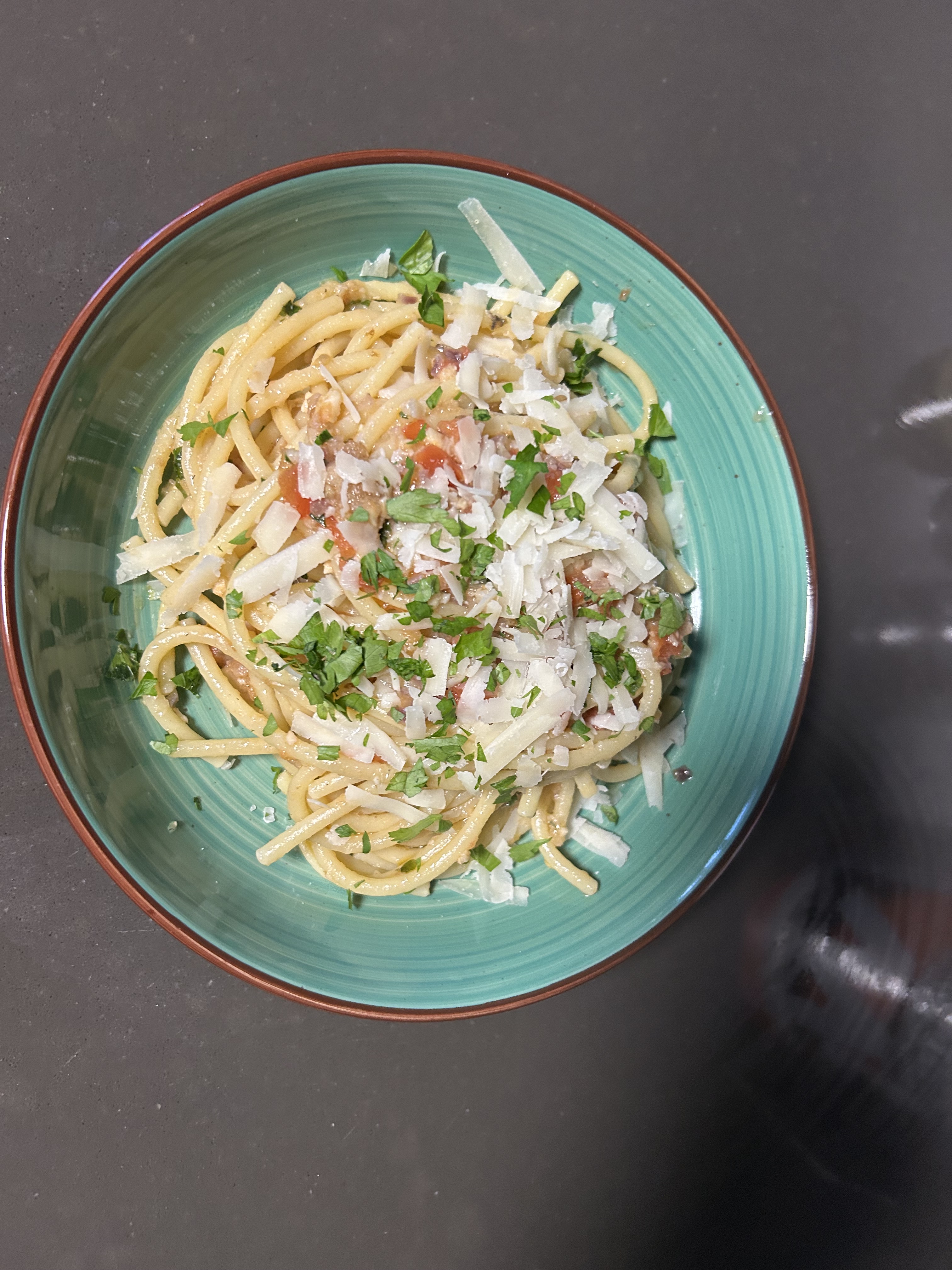 Bring a large pot of salted water to a rolling boil. Add the buctatini pasta and cook for 10-12 minutes, until tender with a slight bite (al dente). As the pasta dances and softens in the bubbling water, reserve 1/2 cup of the pasta water before draining.